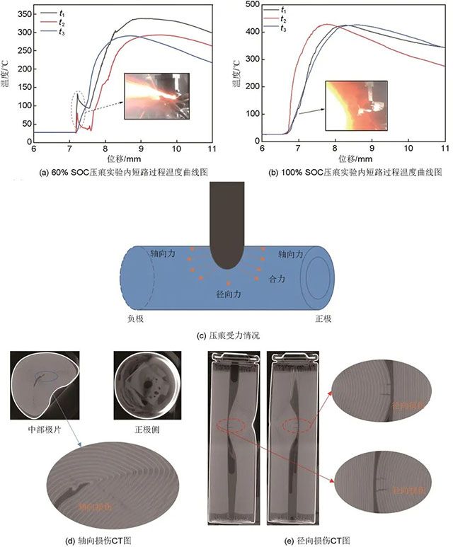 如图5(c)所示,在球头压痕试验中,球头施加到电池表面的载荷方向与接触面垂直。随着压痕深度的增加,电芯受到径向与轴向的压力,两种不同的作用力对极片的破坏形式不同,径向力对极片与隔膜强度产生破坏,轴向力主要对电极产生剪切破坏,两种力同时对电池产生作用效果。从图5(d)中可知,内短路发生前期,中部极片出现层间裂纹,安全阀出现结构性破坏,被压两侧均有极片裂纹,局部电极破坏形式较多,内短路发生后温度骤升。总体来说,在初始压痕过程中,电池内部结构由于挤压产生较大压力,内部气压在正极侧、中部、负极侧大量积聚至内短路产生。电池正负极处均出现破裂,极片和隔膜从正负极位置向外突出,中部压痕区域层间破坏显著,