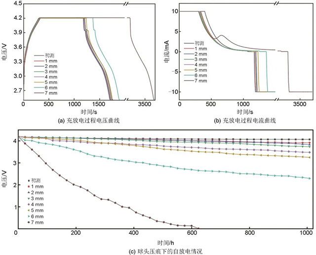 (4)压痕状态下的电化学性质探究中,虽然不同压痕深度电池恒流充电容量近乎相同,但恒流放电容量随着压痕深度增加而逐渐降低。在压痕深度为5 mm之前,容量衰减趋势接近线性,超过6 mm之后大幅下降,这是因为更多的短路电极对影响电池容量。