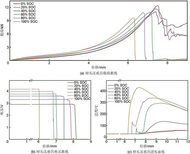 为明确球压过程中的各个阶段及相应的特征,探究全域机械负载下的圆柱型电池力-电-热耦合响应,确定电池在不同SOC下的球头压痕特性。图3(a)为不同SOC电池球头压痕实验电压及载荷变化数据,可见压缩深度为0~4 mm时,载荷缓慢上升,电芯在4 mm压缩深度时被压实,4 mm压缩深度后,载荷急速上升,达到峰值载荷后发生内短路现象。未热失控电池载荷骤降至5~8 kN,热失控电池载荷骤降至0 N。0% SOC电池的内短路压痕位移为7.50 mm,100% SOC电池的压痕位移为6.26 mm,表明SOC越高,电池越容易发生内短路。峰值载荷值随着SOC的增大而减小,0% SOC电池的峰值载荷为12.41 kN,100% SOC电池为9.62 kN。这是因为球头压痕实验在电池的局部位置施加载荷,极片和隔膜受到轴向和纵向双重压力(图1),锂离子嵌入负极形成稳定结构,对径向受力起“抵抗”作用,电极轴向受力使得电池出现剪切力破坏导致隔膜的损坏,进而引发电芯电极出现断裂带,诱发了更剧烈的内短路行为,产生局部短路电流。短路电流通过极耳从初始的电极对传输到短路电极对形成回路,电池短路带呈现两端蔓延现象。