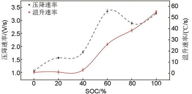 (2)基于温升响应的电池球头压痕实验表明,60% SOC电池内短路瞬间温升速率极高,安全阀损坏并喷射火花,随后因副反应温度再次升高并蔓延至负极。100% SOC电池反应更剧烈,温升速率更高。压痕实验显示,电池受压后内部结构受损,内短路引发热失控,温度从压痕处向两侧扩散,导致燃烧现象。