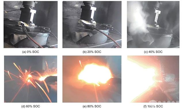 在碰撞事故中,电池会受到不同方向和程度的伤害。电池包的框架受到膨胀和挤压,可能会对电池造成球压的现象,从而触发内短路机制。为探究不同SOC下电池的安全特征,以1 mm/min的速度对0%、20%、40%、60%、80%和100% SOC的锂离子电池进行压痕试验,且达到9 mm压痕停止工作。试验结果如图2所示,当SOC为0%、20%时,电池仅出现电解液外流,见图2(a)、(b),SOC为40%时,出现淡烟,伴有刺激性气体产出,电解液外流现象更严重,见图2(c),以上测试样品均未发生热失控。SOC为60%时,正极侧、负极侧出现大量浓烟,安全阀被打开,正极侧喷射火花,随之负极侧也喷射火花,最终电池多区域同时发生火花喷射现象,见图2(d),电池发生热失控。SOC为80%和100%时,火花喷射现象后,电池持续燃烧约7 s,热失控现象进一步加剧,见图2(e)、(f)。