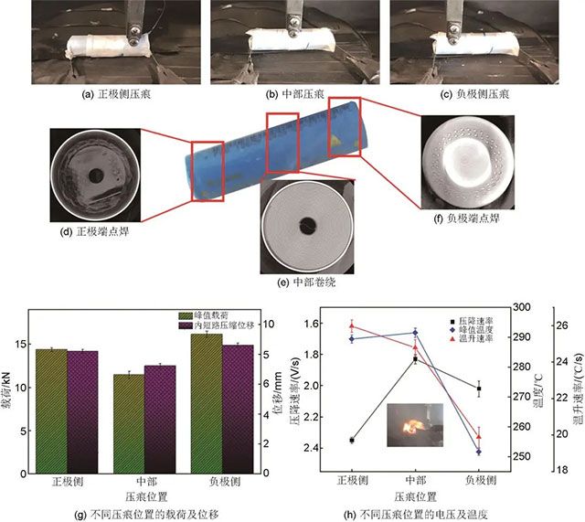 电池正极侧、中部、负极侧结构有所不同,因此球头压痕过程中,压痕位置不同,实验效果也会有所不同。选择60% SOC 18650电容型锂离子电池,补充对电池正极侧与负极侧的球头压痕实验,如图6(a)~(c)所示。正负极两端与外壳所构成的结构完整性更强,见图6(d)、(f),承载能力也就越强。而电池外壳中部与电芯层之间存在间隙,见图6(e),受力较薄弱。图6(g)展示了不同压痕位置造成的峰值载荷及失效位移。正极侧、中部、负极侧位置峰值载荷分别为14.36 kN、11.44 kN、16.14 kN,中部压痕载荷值小于两侧位置,负极侧峰值载荷最大。内短路时的压痕位移也呈现同样的变化规律,如图6(h)所示,正极侧压降速率更大,更容易发生内短路,这是因为正极结构易发生损坏,且靠近安全阀;中部位置峰值温度最高,这是因为内短路发生在电芯中部,温度蔓延效应的导致两侧温度升高,可燃烧活性物质更多,燃烧更加充分。正极侧位置温升速度更大,这是因为正极离火花喷射点位置更近。综上可知,正极侧位置的球头压痕更易发生内短路现象,对电池的整体破坏更强。