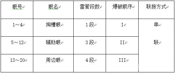 起爆采用毫秒延期雷管,采用反向起爆,即起爆药包置于临近孔底, 掏槽眼最先爆破, 崩出一个楔形槽子穴, 以造成第二个自由面,接着爆破辅助眼,它可崩落大量岩石,为周边眼的爆破加大自由面,接着爆破周边眼,客观存在的作用是控制巷道轮廓,最后爆破底眼,目的是将巷道内岩石起到抛掷和松散的结果;