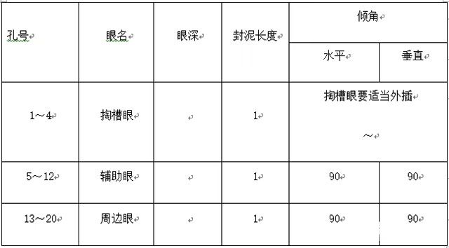 根据总结的经验,先选取炮眼数目为21个,其中6个掏槽眼、3个辅助眼、28个周边眼,设计掏槽方式为楔形掏槽,其炮眼布置如下后附图: