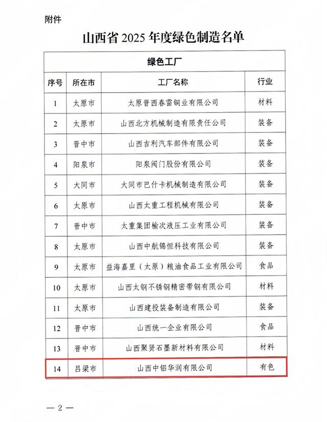 近日,山西省工业和信息化厅正式公布2025年度绿色制造名单,
