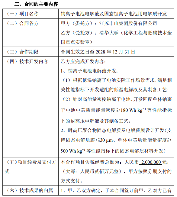9月19日,丰山集团宣布和清华大学化学工程开展合作,双方将围绕高端精细化工新材料、电子化工新材料等多个方向,开展研发、小试及中试多层次合作。这次合作是为了共同推进钠离子电池电解液及固态锂离子电池用电解质项目的技术开发,通过校企资源互补,加速科技成果转化,增强丰山集团的核心竞争力。合作项目总经费为含税人民币200万元。