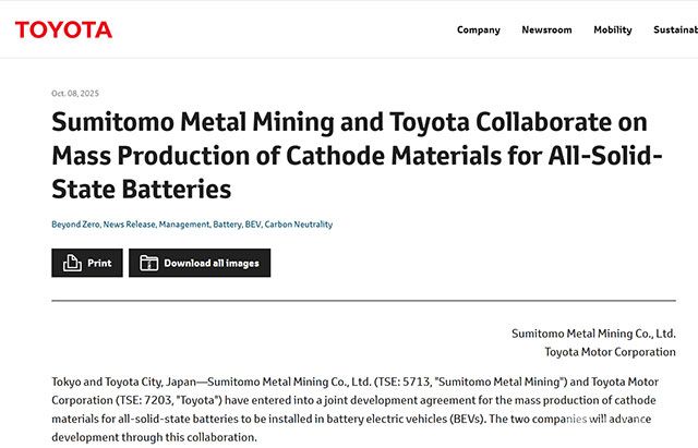 近日,丰田汽车(Toyota Motor Corporation)与住友金属矿山株式会社(Sumitomo Metal Mining Co., Ltd.)联合宣布,