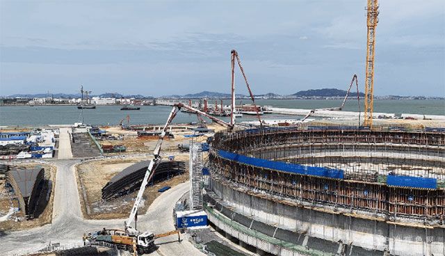 这座相当于18层楼高的能源要塞,在沿海强风高湿环境下,对设备稳定性提出严苛考验。徐工第三代智能臂架技术展现卓越性能,将臂架摆动幅度控制在毫米级(水平<130mm/垂直<100mm),宛如"高空绣花"般精准完成C50高标号混凝土的输送作业。项目技术负责人表示:"每座储罐需连续浇筑72小时,设备稳定性直接关系工程质量。"