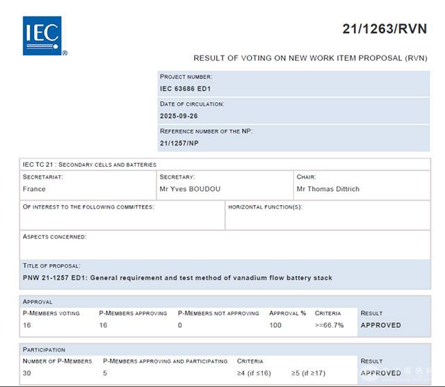全钒液流电池因其安全性高、循环寿命长、储能规模灵活可调等显著优势,成为可再生能源并网、电力系统调峰等大规模储能领域的关键技术。随着全球能源结构转型加速,建立统一的全钒液流电池技术标准成为行业迫切需求。此次提案投票获得16个IEC P成员(积极参与国)一致支持,充分展现了国际社会对这一技术的高度关注与认可。