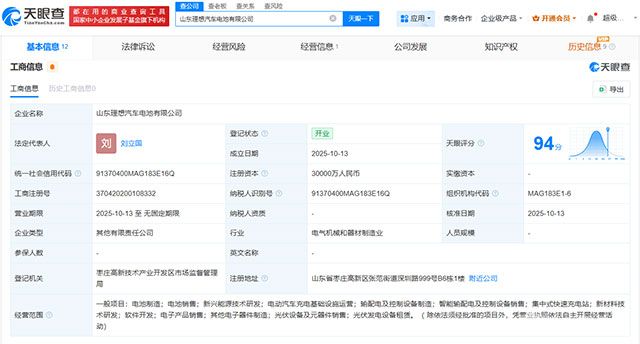 天眼查信息显示,山东理想汽车电池有限公司近日正式成立,注册资本3亿元,由刘立国担任法定代表人,经营范围涵盖电池制造与销售、新能源技术研发、充电基础设施运营等核心业务。股东信息证实,该公司由北京理想汽车有限公司和欣旺达动力科技股份有限公司共同持股,各占50%股份。