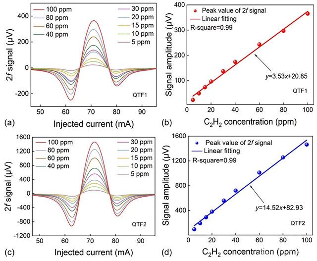 基于商用石英音叉(QTF1)和圆形头石英音叉(QTF2)的C2H2-LITES传感性能测设:a.不同C2H2浓度下2f信号峰值(QTF1);b.浓度线性响应(QTF1);c.不同C2H2浓度下2f信号峰值(QTF2);d.浓度线性响应(QTF2)。