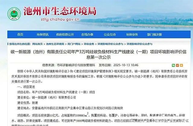 负极材料生产线建设(一期)项目环境影响评价信息第一次公示》,标志着这一总投资达11亿元的重大新能源项目正式启动,为池州市