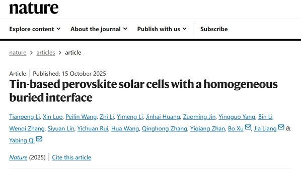 相关成果以《基于均一埋底界面的锡基钙钛矿太阳能电池》(Tin-based perovskite solar cells with a homogeneous buried interface)为题,于北京时间10月15日晚间在《自然》(Nature)期刊以加速预览的形式在线发表。