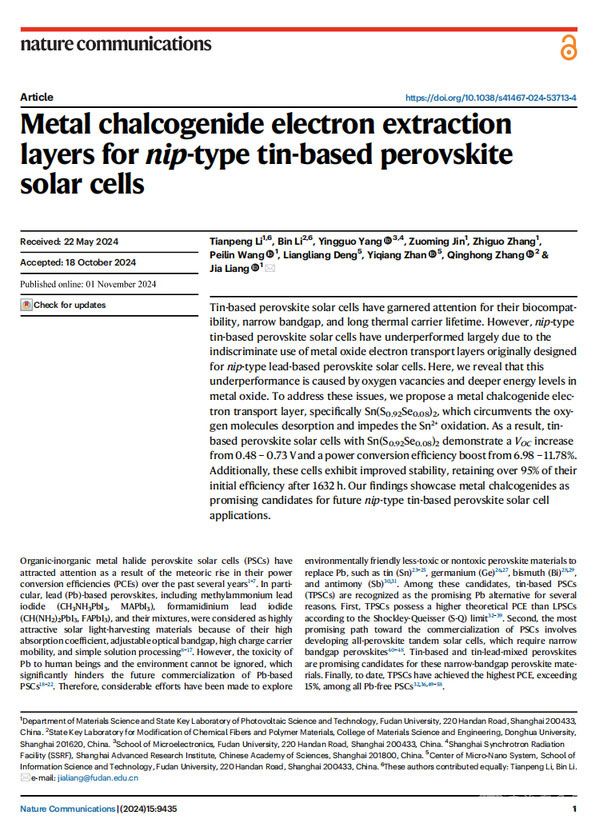 团队此前关于金属氧化物功能层的研究发表于2024年的Nature Communications上,文中提出了一种新型金属硫族化物功能层材料,改善了金属氧化物功能层表面氧空位诱导锡基钙钛矿材料分解的问题,这为他们制备出更高效率的太阳能电池提供了理论基础。