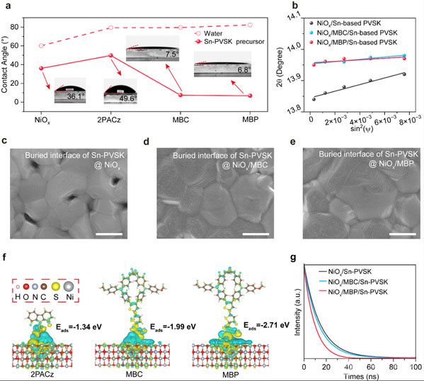 镍为底层基底,并在其上构筑一层自组装单分子层(SAM),从而形成均一且功能协同的复合功能层。“氧化镍与钙钛矿直接接触,表面的氧空位会引起锡基钙钛矿的分解,自组装的分子层能够分隔开它们。”梁佳解释。