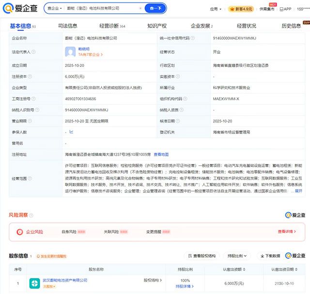 爱企查APP显示,近日,蔚能(澄迈)电池科技有限公司在海南成立,法定代表人为赖晓明,注册资本为6000万元,经营范围包含:电动汽车充电基础设施运营;蓄电池租赁;