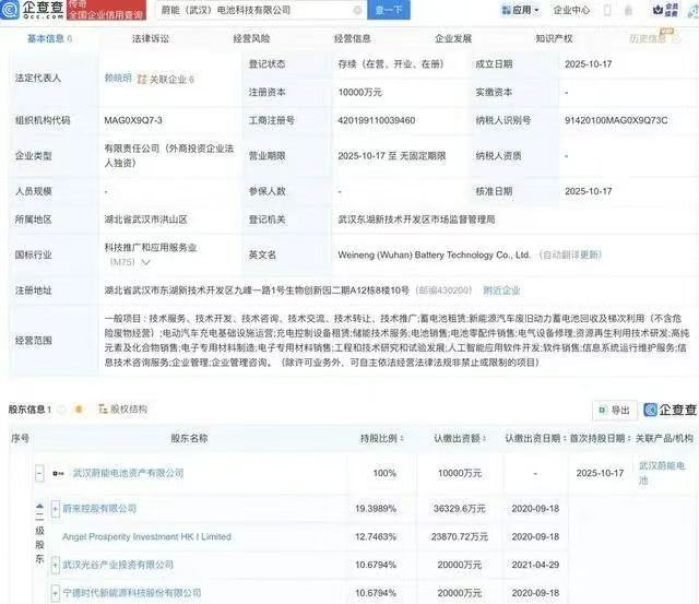 企查查股权穿透显示,该公司由武汉蔚能电池资产有限公司全资持股,后者由蔚来控股有限公司、宁德时代等共同持股。