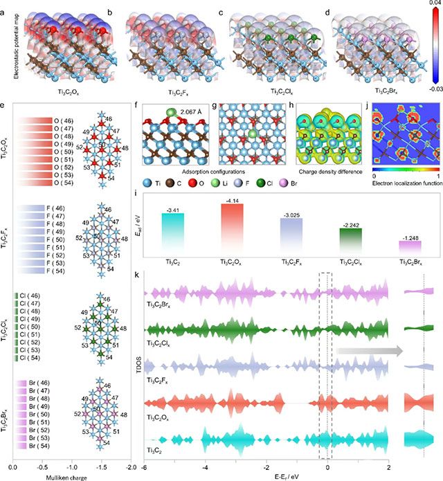(e) Ti3C2Ox、Ti3C2Fx、Ti3C2Clx和Ti3C2Brx的Mulliken电荷分布。