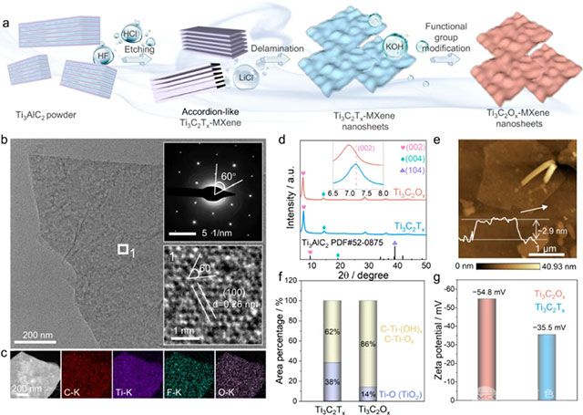 (a) 通过选择性刻蚀和表面端基调控从Ti3AlC2合成Ti3C2Ox的示意图。