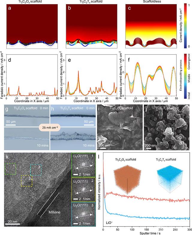(a, d) Ti3C2Ox、(b, e) Ti3C2Tx和(c, f) 无支架体系的锂沉积电流密度分布有限元模拟。
