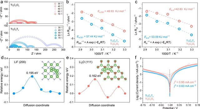 (a) Ti3C2Ox@Li 和 Ti3C2Tx@Li 对称电池的温度依赖性电化学阻抗谱(EIS)。