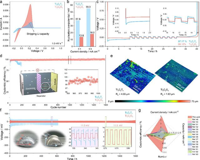 2. 电负性驱动稳定界面:形成了以氧化锂主导的SEI, MXene||Cu半电池实现了1600次长循环,库伦效率达99.41%。Ti3C2Ox@Li对称电池表现出超过 1600 小时的出色长期稳定性。