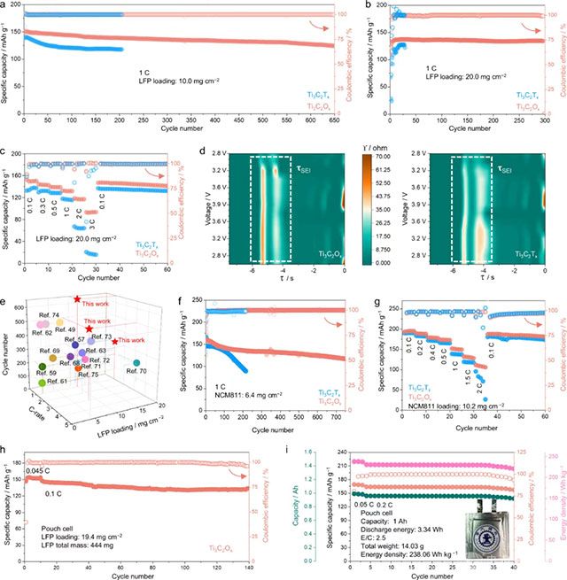 (h, i) Ti3C2Ox@Li||LFP软包电池在0.1 C和0.2 C下的循环性能。