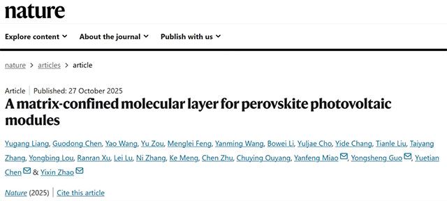 近日,Nature在线发表了上海交通大学环境科学与工程学院赵一新教授团队题为“A matrix-confined molecular layer for perovskite photovoltaic modules”的研究论文。该研究创新性地提出一种“基质限域分子层”型空穴传输层构型新概念,通过与