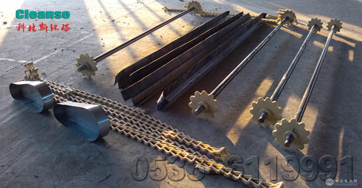 链条式刮渣机主要用于气浮池中,排除液面的浮渣,使水质净化。具有运行稳定、节能、寿命长等优点。该机采用链条驱动方式,带动刮渣板连续运转,具有传递扭矩大,运转平稳,稳流效果好等优点,适用于气浮池液面上浮渣的排除。链条式刮渣机主要由刮渣板、链条、链轮、涨紧机构、减速机等。