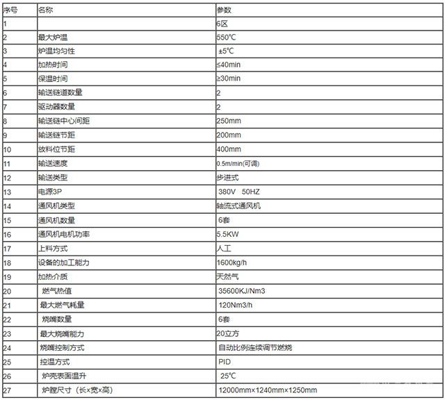 天然气铝棒加热炉用途: 强对流输送链式天然气铝棒加热炉主要适用于连续作业的铝棒坯挤压成型材前的加热。采用天然气加热,强对流加热炉可以在较短的时间内完成铝棒加热,恒定的炉温均匀性。将铝棒放在传送链专用放料链板之上,步进式交迭进入炉内,前后炉门在输送链步进停止时放下,降低炉内热量外排。在进料端装料是人工手动完成的,加热之后自动顺链条运行送出。