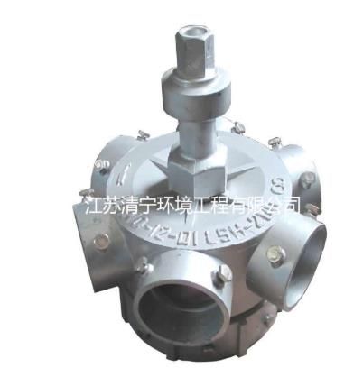 该装置由驱动电动机,针摆减速机及旋转阀组成,采用JZT电磁阀速电机驱动,利用行星摆线针轮减速机减速,使阀芯旋转,有压力污水由进水管导入旋转阀芯内,经阀苡配水缝隙进入出水室,由出水管将污水送出,由于配水缝隙随着阀芯旋罱因此在某一时间内只有一个出水管将水送至配水点,出水管的配水周期可通过改变电动机的转数来实现。