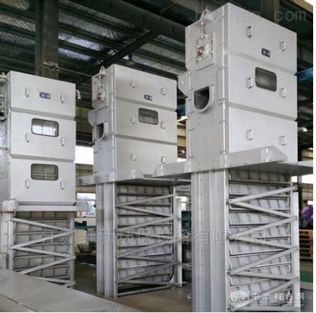 内进流式孔板格栅除污机主要由驱动装置、机架、牵引链条、带提升阶梯的网板、冲洗系统及电气控制柜等主要部件组成。机架安装于格栅渠的中央,机架两侧与格栅渠之间的间隙为格栅滤后出水的通道。在机架的迎水端两侧与渠壁间布置了导流挡板,其在导流的同时,可防止污水短流由滤前直接进入滤后。机架下部迎水端开有一个进水洞口,其对侧为封闭端。污水由进水洞口流入机内后经两侧网板流出,并经两侧出水通道汇入机后渠道中。驱动电机安装在机架正向的输出轴上,两侧网板在传动链条的带动下,自下而上将其长度范围内截留的污物向上提取,抵达上部时,通过链轮的转向功能,在顶置的冲洗装置的冲洗水作用下,自动完成卸污工作,渣水排入两侧网板之间的集渣槽后自流排出机外。