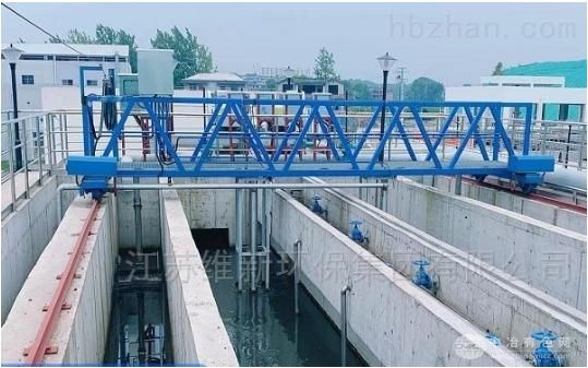 桥式吸砂机在沉砂沉池面上沿钢轨来回运动,机上的吸砂泵(潜污泵)将池底的砂水混合物吸出并提升至一定的高度,进入砂石分离器进行分离,同时机上可设撇渣板将水面上的浮渣刮至池末端的渣槽中。