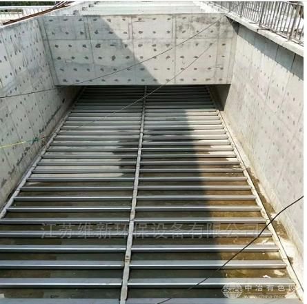 1、导轨安装:安装导轨固定支架,池壁的中心线作为该侧轨道中心线,也是安装完成后该侧行 走轮的中心线。以此中心线为基准,根据设计尺寸和桥架驱动梁的实际距离,准确定出另一侧轨道中心线。核测轨道中心线高程,处理混凝土基面,准确放出螺栓孔位臵,将支架底板与安装线上的预埋钢板焊接,焊接时应保证各底板中心在一条线上,两线的跨距的偏差不超出±10mm。敷设导轨,调整导轨使其直顺度、平整度和两条导轨间距离符合要求,将固定螺栓拧紧,化学螺栓在外方专家指导下使用。焊接压板,完成轨道安装。将带有端梁轮架的桥架用起重机吊至池上方的工作位臵,整体下落桥架,各支撑点缓慢均匀下落,做到两个端梁轮架同时着地。各车轮都必须与轨道接触,不允许有悬空现象。铺设钢轨,以鱼尾板连接相邻两段钢轨,调整其高度及左右 位臵,保证导轨直线度不超出3mm,跨距的偏差不超出±5mm,导轨顶面的标高偏差不超出5mm,坡度不超出1.5mm/1000mm,以压板分段固定,螺母不得松动。