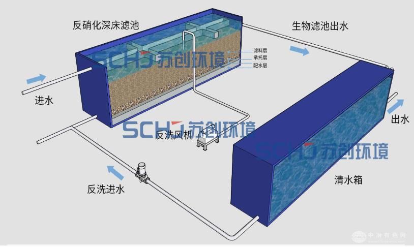 反硝化深床滤池是一种能同时去除TN(总氮)、SS(悬浮物)、TP(总磷)的生物滤池系统,滤料采用特殊规格及形状的石英砂或改性陶粒,依靠滤料上生长的反硝化优势菌种的生物作用完成TN(总氮)的去除,深床滤池本身具有过滤功能可以去除SS(悬浮物),同时可根据水质情况通过投加PAC实现TP(总磷)的去除。