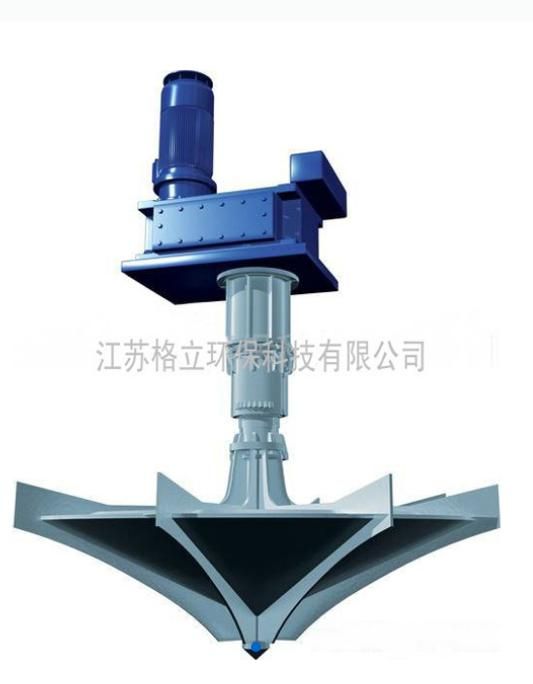 其结构采用平行立轴式减速驱动机构、可上下调节安装底座、传动轴、双轴向力传动装置、高强度联轴器、倒伞叶轮组成。驱动机构带动传动轴及叶轮旋转,旋转叶轮将底部污水及污泥沿叶轮倒锥螺旋状提升,上升的污水挟带周边水体从叶轮边缘甩出,形成水跃并裹进大量空气实现充氧曝气。并将池底层含氧少的混合液向上提升环流、更新,同时在叶轮旋转的推动和提升作用下,推动水流在氧化沟内以>0.3m/s的水速呈螺旋形的状态向前环流,使沟内活性污泥混合液保持悬浮状态,达到充氧的目的。