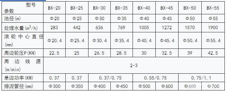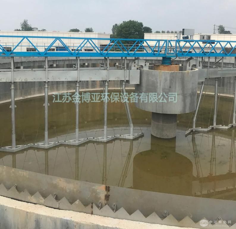 驱动装置推动工作桥沿池平面旋转,工作桥带动排泥槽旋转,固定于泥槽上的吸泥管在静水压力的作用下吸取池底的污泥,经过泥量调节阀调节,进入排泥槽,排泥槽中的污泥流入泥缸中,排出池外;也可以通过虹吸作用将泥从排泥槽吸入泥缸中将泥排出。同时池中浮渣由浮渣刮板收集到排渣斗排出池外。