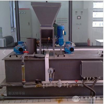 药剂配置时,干粉药剂从螺旋推进器内进入速溶器与进水进行预混,被湿润的干粉药剂进入配置槽进行搅拌稀释,按要求浓度进行配置,配置过程中,进水管设流量计以保证进水量相对稳定,从而保证在整个过程中,配置的溶液浓度基本不变。