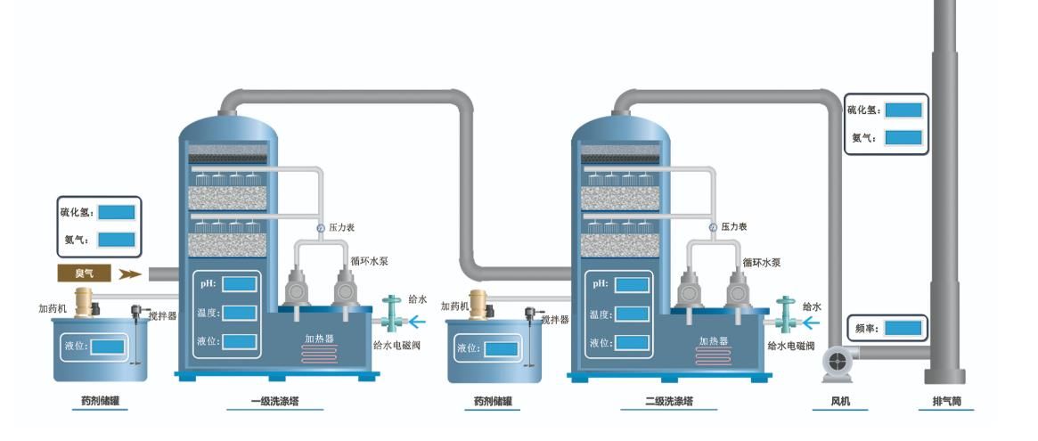 化学洗涤塔化学洗涤塔针对集中式大流量的有机臭气设计的除臭设备,主要由塔体、循环水箱、喷淋系统、填料、加药系统和电控系统组成。塔体可选用PP、FRP、PVC、SUS304、SUS316、SUS316L等多种材质,满足不同环境的使用需求;循环水箱可实现水资源循环利用,节约运行成本;另在水箱和加药箱内配备pH计、液位计等仪表,在电控系统的整合下实现自动化添水、换水、加药、搅拌,操作便利。