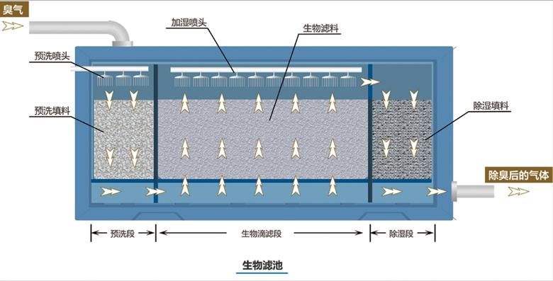 生物滤池的内部由三段式组成,分别是预洗段、生物滴虑段、除湿段。
