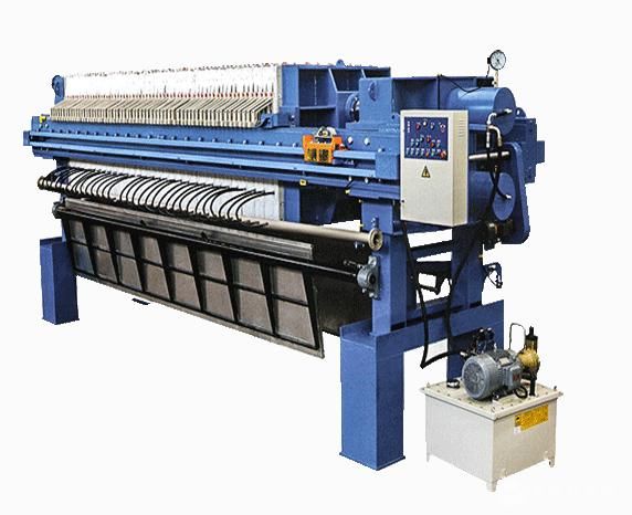 板框式压滤机是通过板框的挤压,使污泥内的水通过滤布排出,达到脱水目的。它主要由凹人式滤板、框架、自动-气动闭合系统测板悬挂系统、滤板震动系统、空气压缩装置、滤布高压冲洗装置及机身一侧光电保护装置等构成。