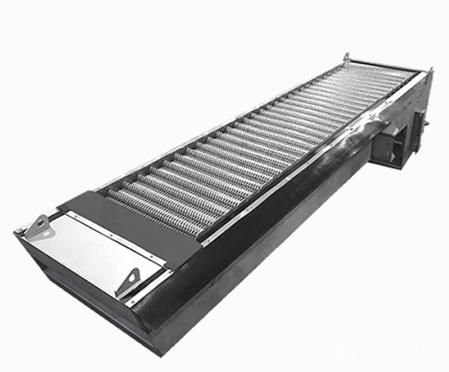当格栅链在减速机驱动机构的驱动下,按工作方向做循环运动,此时水槽中的水流经齿耙栅隙,耙齿格栅对水中的固体杂物进行拦截,并由运动中的耙齿将其捞起,随耙齿链一起向上运行到达顶部后,通过链轮和弯轨的导向,使每组耙齿之间产生相对运动,达到自清目的,致使大部分固态杂物因自身重力而落下,另一些粘附在栅缝中的杂物在反转清洗刷的作用下把耙齿的杂物洗刷干净,并均匀地落入螺旋输送机中。由于耙齿格栅链是一个封闭式循环机构,所以它可以自动连续地工作,对水中漂浮杂物不断地进行清除。