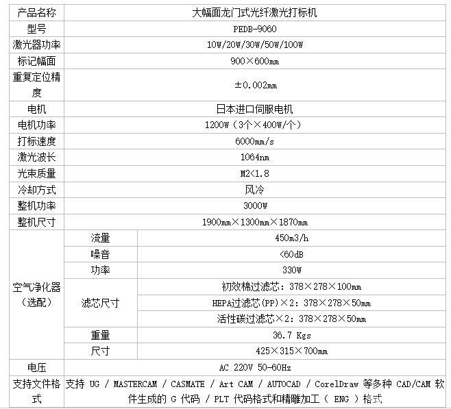 嘉信激光*推出光纤激光打标机PEDB-9060。本机采用龙门式结构,运行稳定。超大工作台既可满足大型材料整体加工,又支持多块材料拼接式打标。它的出现解决了传统机型加工幅面的局限性,拓宽了激光打标的应用领域,赢得了更广泛的市场。