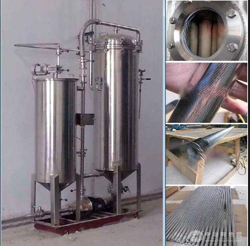 ZS系列烛式硅藻土过滤器在一密闭的容器里,组合多根多孔滤芯,在滤芯外套上过滤滤布(或其他过滤介质),过滤时用泵将料浆送入过滤器中,料浆中的液相穿过过滤介质进入多孔滤芯的中心汇总到清液出口排出,在滤饼层未形成前,排出的“清液”再回到原料浆进口送至过滤器作循环过滤,直至滤饼层形成(能达到过滤要求),提供一信号控制清液不再循环,清液通过三通阀送至下道工序使用,进行正常过滤。