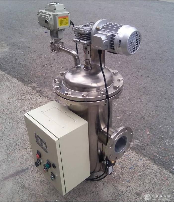 电动吸吮式自清洗过滤器在过滤网内安装一个吸吮扫描器,扫描器电机带动做螺旋运动,在过滤器端盖上安装一个排污阀。清洗时,电机带动吸吮扫描器扫过滤网表面,吸掉污物杂质,并通过排污阀排出过滤器。清洗时无需断流。当水自电动吸吮式自清洗过滤器中流过时,滤网逐渐积累水中的脏物、杂质、形成过滤饼堆积在滤网的表面,从而导致进、出水管之间出现水压差,当过滤器的压差达到预设值时,将开始自动清洗过程,此间净水供应不断流,清洗阀打开,贮污室及吸污室内水压大幅度下降,过滤筒与吸污管与清洗室之间通过吸嘴产生一个吸力,形成一个吸污过程。同时,电动吸吮式自清洗过滤器电力马达带动吸污管沿轴向做螺旋运动。吸污器轴向运动与旋转运动的结合将整个滤网内表面*清洗干净。整个冲洗过程约35秒到90秒。排污阀在清洗结束时关闭。过滤网开始下一个冲洗周期。