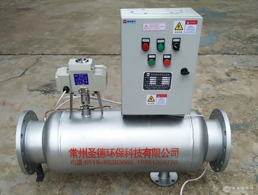 反冲式过滤器水流导向阀的开启机构分手动和电动两种,当采用电动开启机构时,设有时钟控制电控箱,可按设定时间要求实现自动清洗排污,此时排污口装电动球阀、水流导向阀和排污电动球阀实现联动。