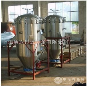 密闭板式过滤机主要是由过滤器主机和混和搅拌罐、输送泵、管道、阀门、电气控制等一些辅助设备组成的一个完整的过滤系统,其过滤工艺需视被过滤介质而定。过滤机主体是由滤槽、滤网片,起盖机构、自动排渣装置等组成。助滤剂在混合缸中与物料混合后,通过输泵在滤网上形成滤饼,达到稳定的滤饼层后,细小的助滤颗粒可提供无数细微通道,挡住细小的杂质,但允许清澈的液体通过,不会有所堵塞,这样物料就通过滤饼层进行实际过滤。滤网片是由多层不锈钢网组成,安装在中心集料管上,装拆清洗方便。