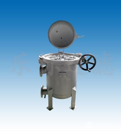 快开袋式过滤器机体主要由三部分组成:过滤容器、支承网篮和过滤袋。根据流量要求可在单机里使用多个滤袋,液体从过滤容器侧面或者下面进液口进入,由被网篮支撑的滤袋上方冲入滤袋中,滤袋因液体的冲击和均匀的压力面展开,使得液体物料在整个过滤袋内表面得到均匀分布,透过滤袋的液体沿着金属支承网篮壁,由过滤器底部出液口排出。滤出颗粒杂质被截留在过滤袋内,完成过滤过程。更换或者清洗滤袋,只需松开环首螺栓,旋转手轮提升上盖,即可取出。