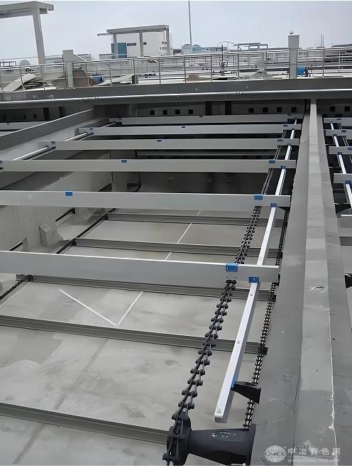 链条式刮泥机是一种刮泥设备,可适用于矩形初沉池与二沉池内表面撇渣与底部刮泥操作,以及各种池体形状的表面撇渣,近几年来在水处理行业中已得到广泛应用。该设备主要由刮泥板、链条、链轮和驱动装置等组成。驱动电机、减速机输出扭矩经过驱动链和链轮传送到刮泥机主轴,主轴链轮驱动铺设于沉淀池两侧的链条做回转运动,刮泥板两端分别安装在两侧的链条上,由从动轮及导轨支撑,去程于池底刮泥,回程于池面撇渣。