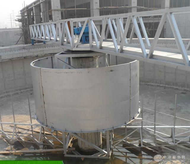 主梁由置于周边的驱动装置带动,绕池中心轴线旋转,沉积在池底的污泥由刮泥板刮集至各吸泥口,在液位差的作用下,污泥经吸泥口,输泥槽、虹吸管、中心泥罐、中心排泥管排至污泥坑。每个吸泥管上端设有调节器,以调节各吸泥管的流量分配。同时,液面上的浮渣向随主梁旋转的撇渣板和周边浮渣挡板形成的渐缩区域内集中,直至其封闭边—刮渣摆臂。当摆臂抵达集渣斗时,由摆臂上的刮渣板刮至集泥斗。
